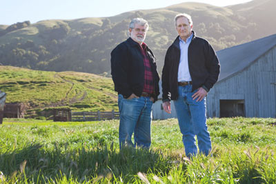 Filmmaker George Lucas (left) and MALT Executive Director Robert Berner (right) at the Corda Ranch, the 67th family ranch protected from development by a MALT conservation easement. (Photo by Paige Green)